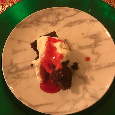 Our grand Christmas and New Year's dessert every year: Chocolate mousse cake topped with raspberry sauce. |